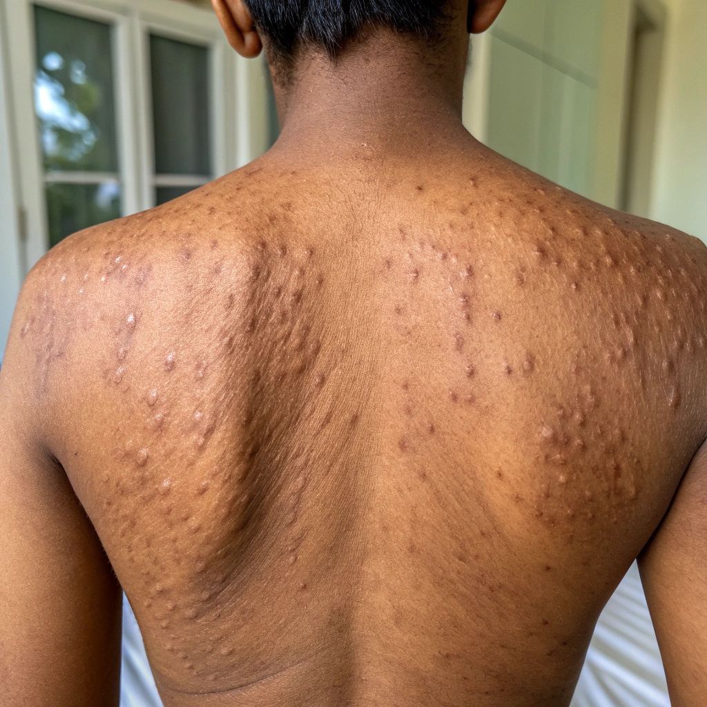 - Appearance: Bumpy, thick patches, often on the back or chest.