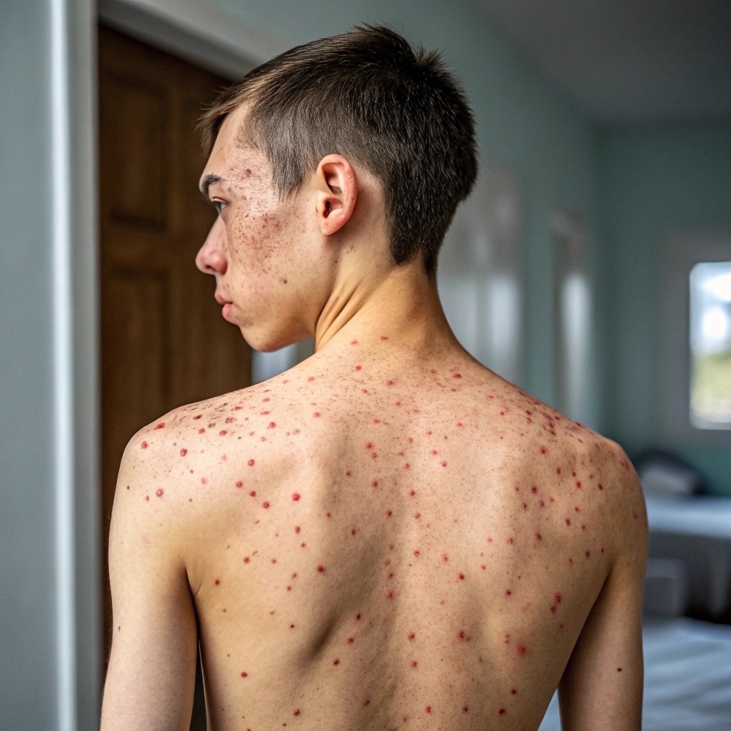 - Appearance: Similar to facial acne but harder to treat due to larger pores.